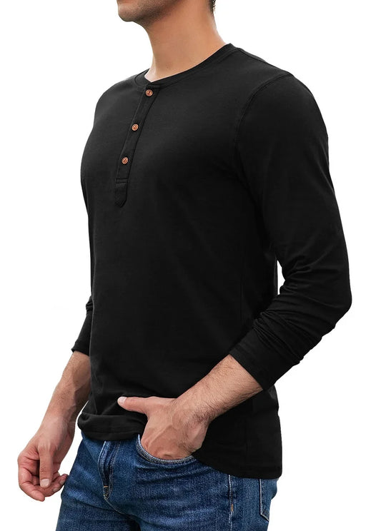Mens Henley Long Sleeve T-Shirt Cotton Casual Shirt US Medium Black